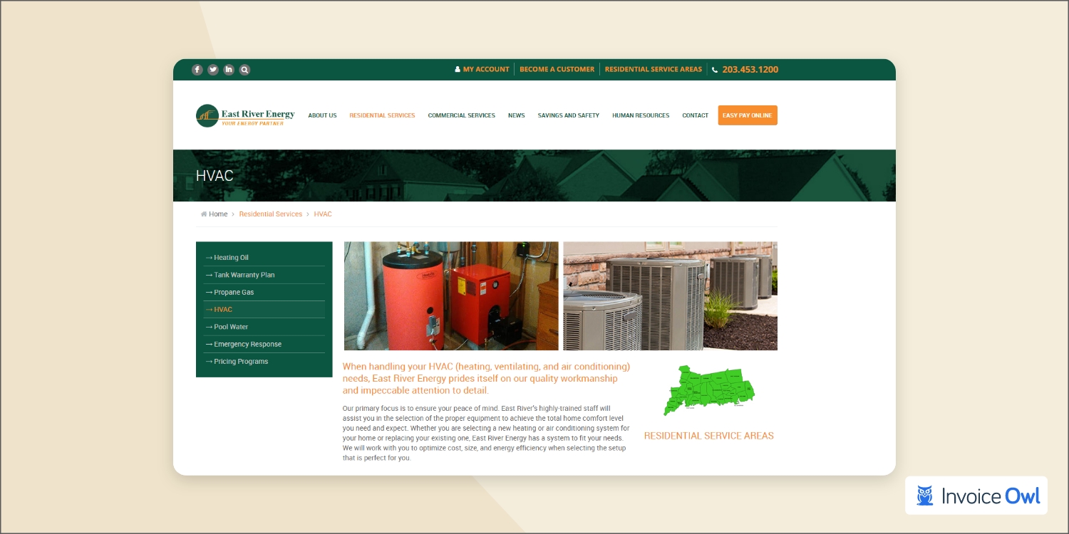 East River Energy's website is professionally designed and has a clean and neat appearance. As you scroll down the page, you will notice an easy-to-navigate navigation bar that allows you to explore the company's commercial and residential services or even delve a little deeper into the company's history. Throughout the site, the HVAC company's logo is featured in green and orange, with excellent use of colors.