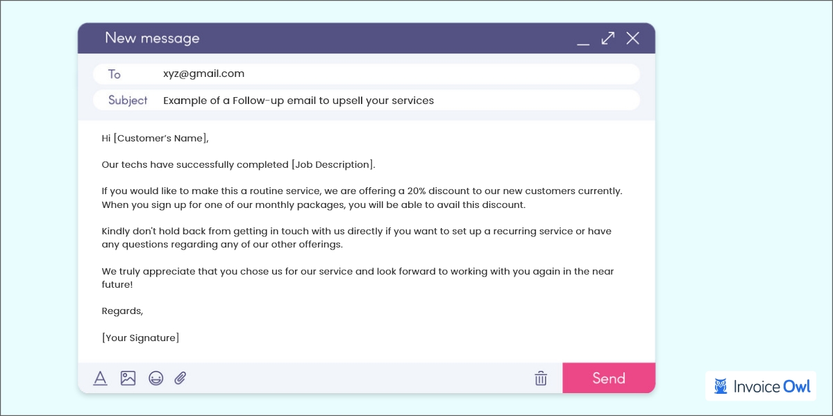 When you're sending an email to a customer after finishing the job, don't forget to include details about any service packages you offer or a new discount as a special deal to hire your services again in the future.