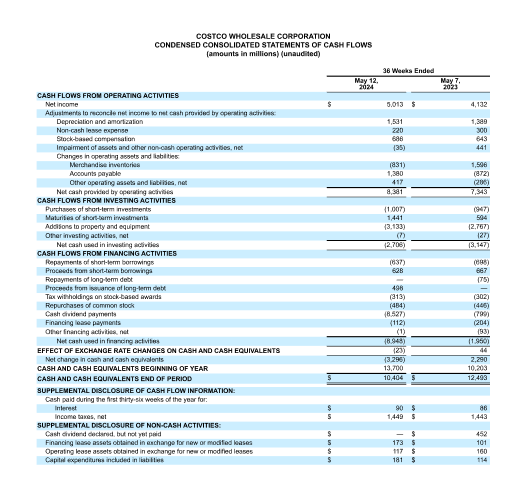 Here is Costco's cash flow statement for the fiscal year of May 12, 2024. All amounts are in millions of U.S. dollars.