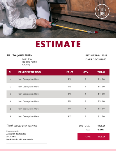 Download professional pest control estimate templates for extermination businesses. Create winning quotes for rodent control, termite treatment, mosquito control, and pest inspections.