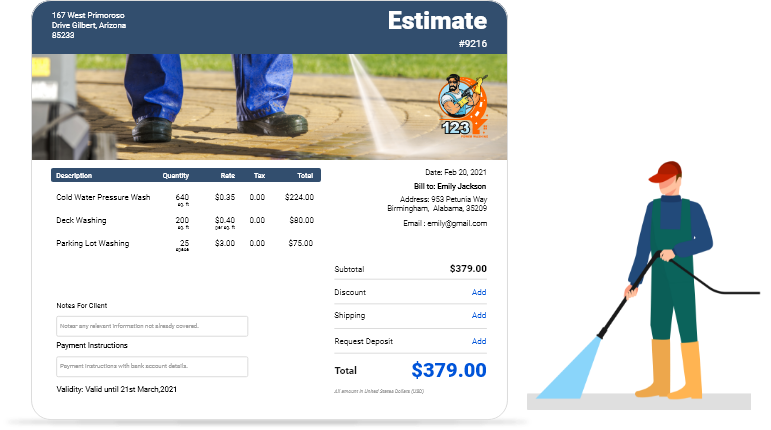 Using a pressure washing estimate template helps you create more effective estimates in less time and effort. Other than that, it helps you maintain the consistency of your estimates. Standardized templates ensure you never miss important details and help you price jobs accurately for profitability.