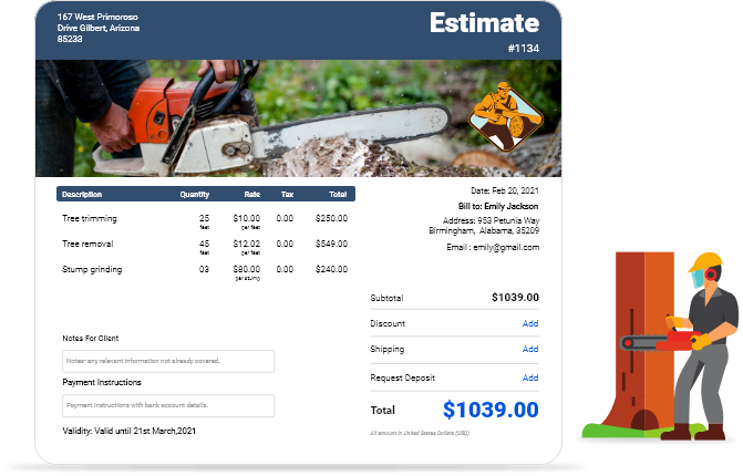 Other than the general information like client's details, service provider's details, and total, the tree trimming estimate must include service description, service rates, taxes, and discounts.
