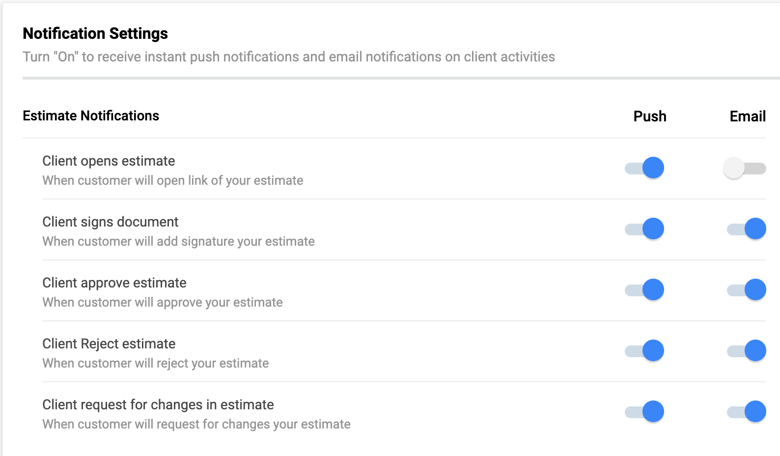 A list will pop up mentioning different notifications for estimates, invoices, purchase orders, and credit memos.