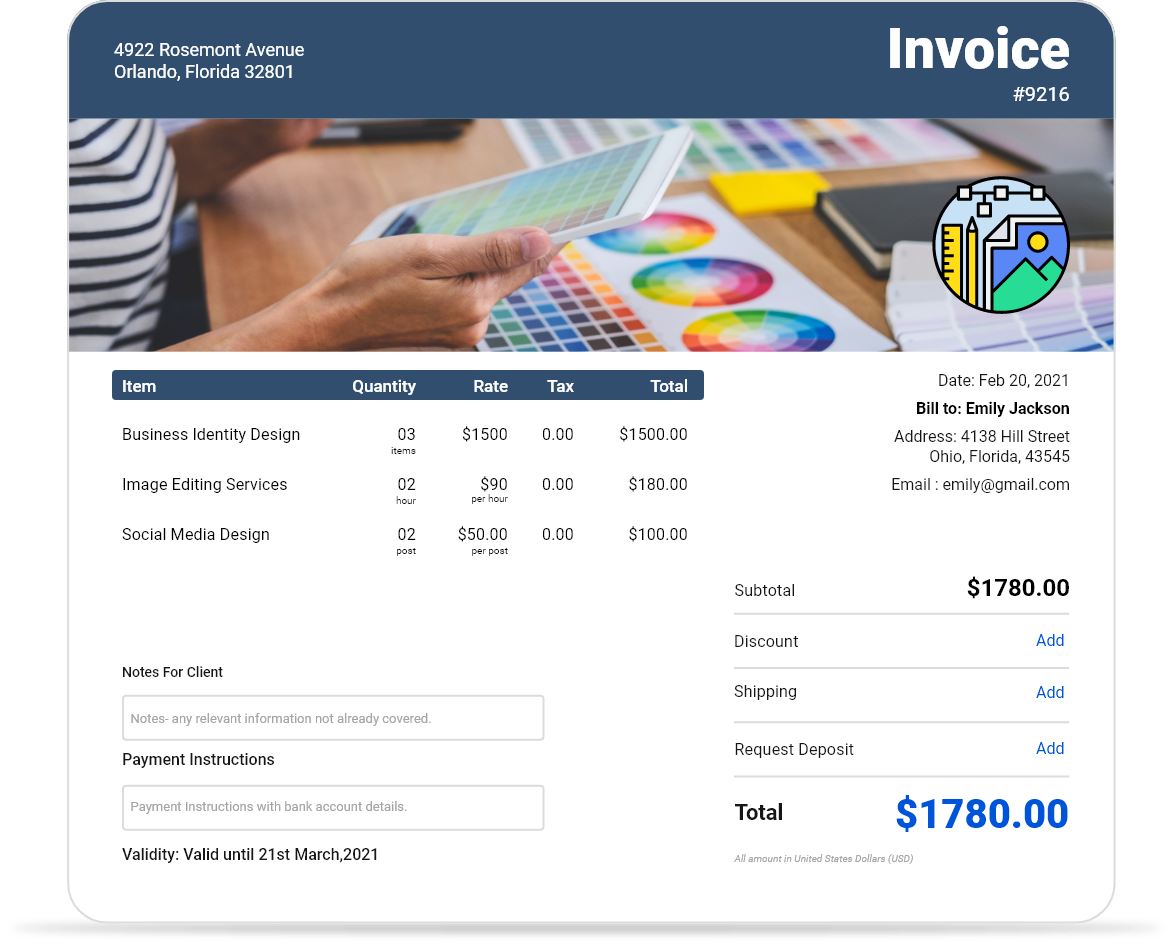 Yes, you must either use an invoice template or add invoicing software to your asset list. Creating and sending invoices to your clients will help you at the taxation time to evaluate financial health, listing down graphic design services you offer, gain knowledge of payments due and outstanding, know when to send follow-up emails, become organized and trustworthy, have an easier book-keeping process, and track graphic design business performance.