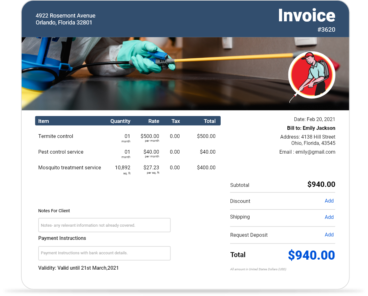 Post-Service Billing: Send an invoice after offering the pest control service at your client's place.