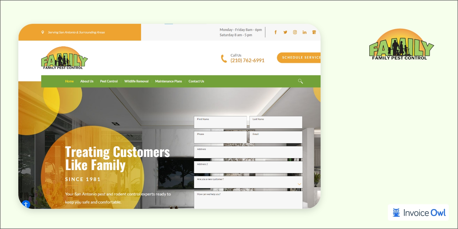 Family Pest Control is one of the top pest control companies in the US, serving San Antonio & surrounding areas. We chose this website for its more intuitive design. Did you get reminded of Orkin's theme seeing this website? We guess you did. The overall design gives a killer look and reminds customers that their services are designed to kill pests effectively.