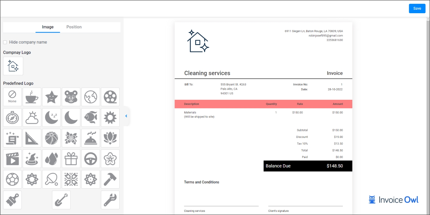 Choose the industry your business belongs to from the drop-down menu. Once you have entered the industry name, InvoiceOwl creates a sample estimate for you. It allows you to personalize your document according to your company preferences. You can add your logo, registered trademarks, watermark, and color combination and format it as you like.