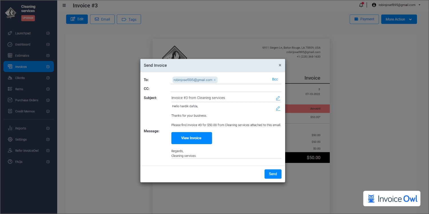 Enter the customer name, email ID, subject line, message, and other relevant information before clicking 'Send.' Click 'Send' to mail the invoice to your customer in no time!