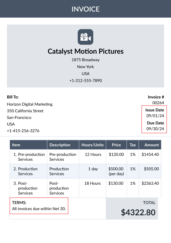 For example, you can use the net 30 terms in the "terms" section at the bottom. Although, a due date is located at the top corner to show when the payment is due clearly. Let's understand it better with the benefits of using net 30 terms.